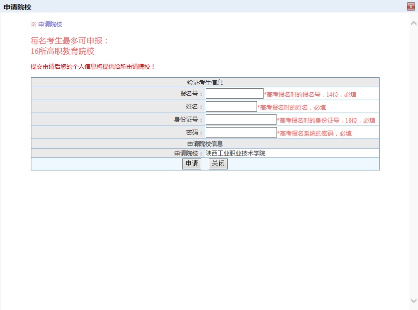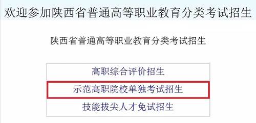 方式一:登录陕西省招生信息考试网(http://www.sneac.com/),进入“陕西省普通高等职业教育分类考试招生——示范高职院校单独考试招生”报名入口申报。