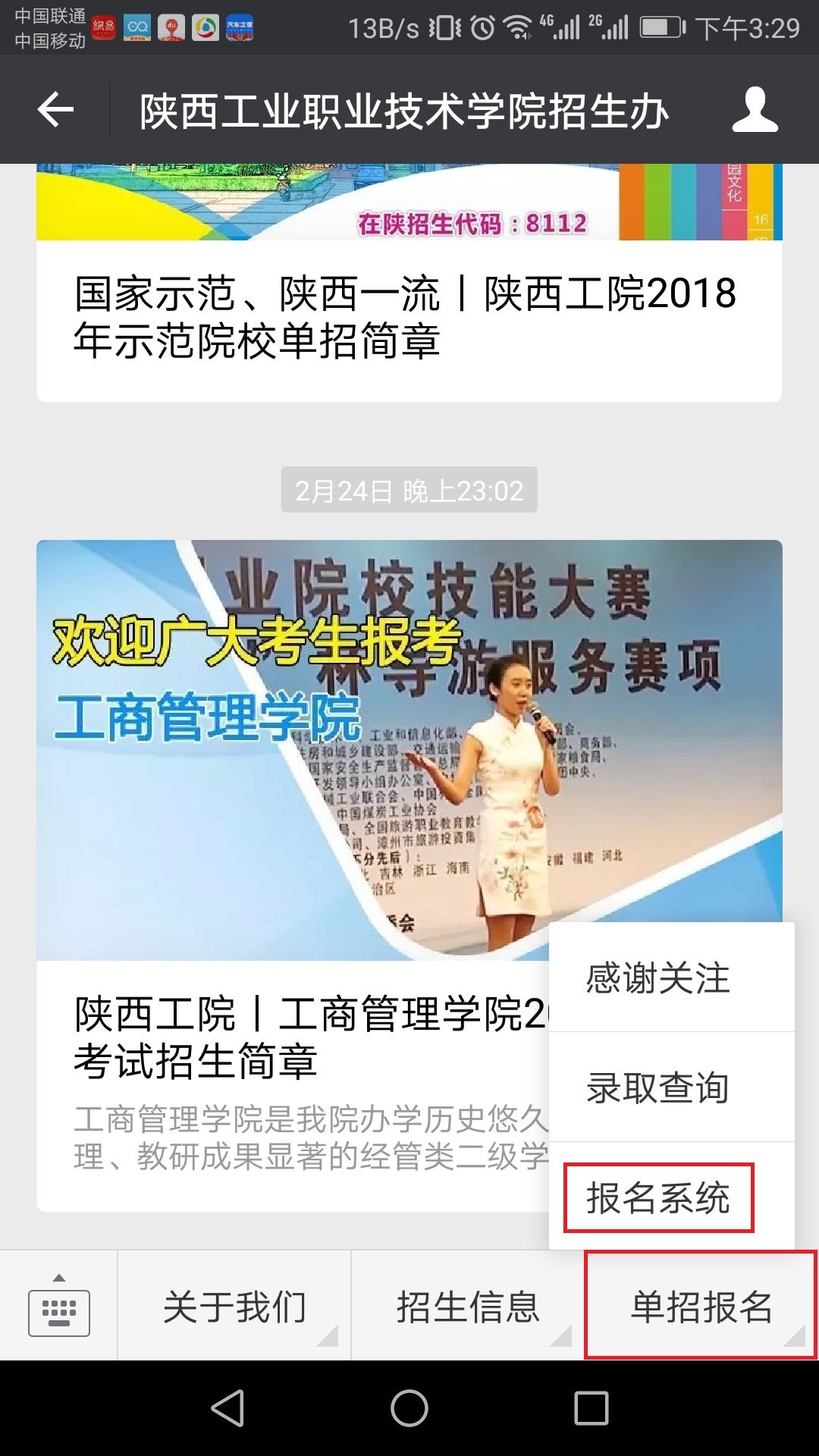 微信用户可关注我院招办微信公众号:SXPIZB,点击“单招报名-报名系统”自定义菜单进入报名系统