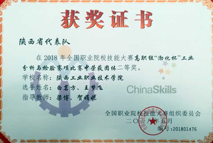 5月10日,2018年全国职业院校技能大赛“渤化”杯工业分析与检验赛项中高职组比赛在天津落幕。经过三天的激烈比拼,在我院化工与纺织服装学院指导教师梁博、贺娟妮及参赛选手白茗方、王梦飞同学的共同努力下,荣获团体二等奖。