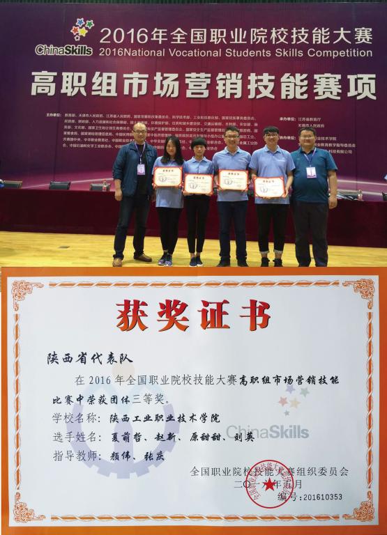 在为期两天的比赛过程中,经过“网络营销、营销基本常识、营销策划案制作、方案现场展示与答辩、情景营销”五个部分的激烈角逐,由我院物流管理学院教师颜伟、张庆指导的市场营销专业赵新(策划1401班)、原甜甜(策划1401班)、夏萌哲(策划1402班)、刘英(策划1402班)四位同学组成的陕西一队脱颖而出,获得团体三等奖,实现了我院在此类赛项中新的突破。