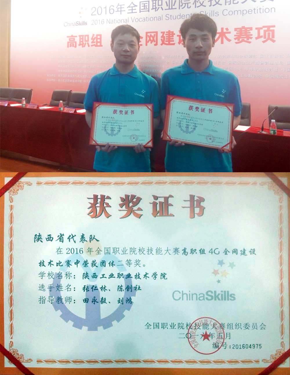 5月19日至21日,2016年全国职业院校技能大赛“4G全网建设技术”赛项比赛在南京信息职业技术学院举行。由我院电气工程学院教师田永毅、刘鸿指导的通信技术专业1401班陈创社、张仁林同学代表我省首次参加该赛项比赛,并取得了二等奖的佳绩。