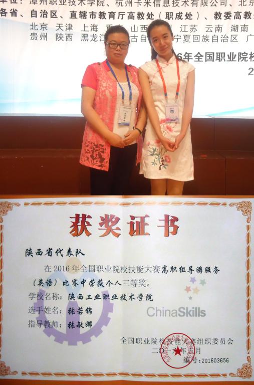 5月11日,2016年全国职业院校技能大赛高职组“导游服务”赛项比赛在福建圆满落幕,由我院工商管理学院旅游管理专业学生组成的陕西代表队从全国30个省、市(自治区)共计143名选手中脱颖而出。经过五个环节的激烈比拼,我院工商管理学院教师张敏娜指导的旅游1401班张若锦同学荣获导游服务英文组三等奖。