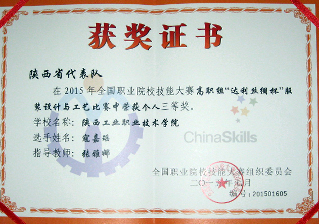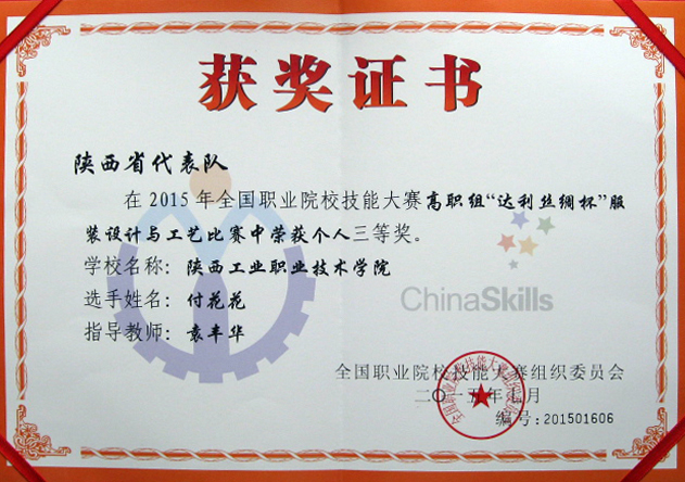6月14日,2015年全国职业院校技能大赛“达利丝绸杯”服装设计与工艺赛项在浙江杭州职业技术学院落下帷幕,我院服装工程学院组成陕西省代表队参赛,经过十个小时的激烈角逐,由袁丰华老师指导的服装制版与工艺1301班付花花同学,张雅娜老师指导的服装制版与工艺1301班寇佳瑶同学荣获制版与工艺赛项的两个三等奖。