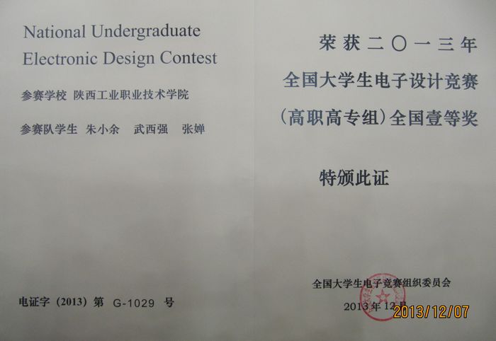 据悉,本届全国大学生电子设计竞赛,共有来自全国的1044所院校,11838支队伍、35514名学生参赛。我院共组建了12支代表队参赛,共获陕西省一等奖4项、二等奖2项。在随后的综合测试中,我院获陕西省一等奖的4支参赛队作品入围国家级奖评审,最终获得国家级一等奖1项,二等奖3项,实现了我院此赛项国家级一等奖零的突破,也填补了陕西省全国大学生电子竞赛一等奖的空白。