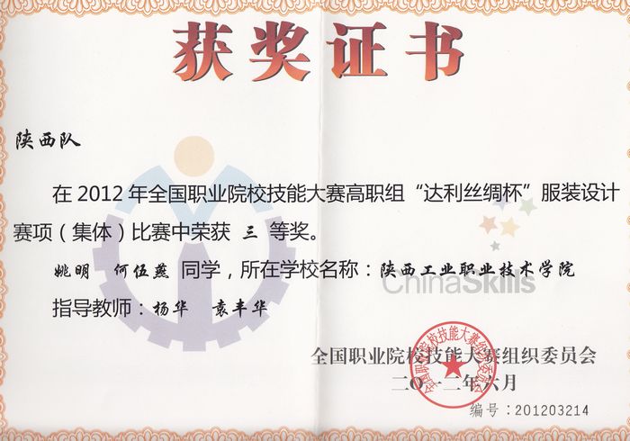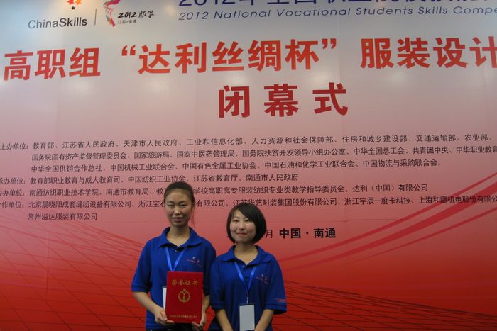 从6月17日上午在江苏举行的2012年全国职业院校技能大赛高职组服装设计赛项闭幕式暨颁奖典礼上获悉,由我院服装艺术学院服装设计专业1001班姚明、1002班何武燕组成的陕西省代表队荣获了本次比赛的集体三等奖,为陕西省和学院争得了荣誉。
