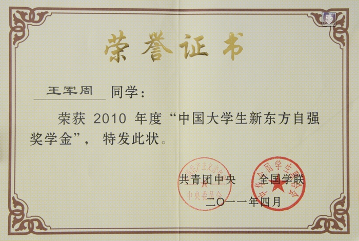 日前,由共青团中央、全国学联主办,中国青年报社和中国高校传媒联盟承办,新东方科技教育集团协办的2010年度 “中国大学生自强之星”、“中国大学生新东方自强奖学金”活动评选结果揭晓,我院信息工程学院王军周荣获“中国大学生新东方自强奖学金”提名奖,并获得中国大学生新东方自强奖学金2000元。