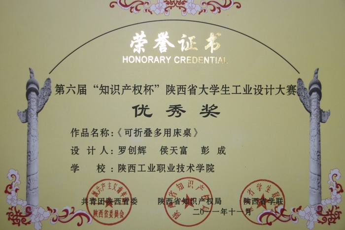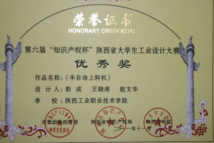 2011年11月25日,由共青团陕西省委、省知识产权局、省学联联合举办的第六届“知识产权杯”陕西省大学生工业设计大赛颁奖典礼在长安大学渭水校区举行,主办方相关领导及获奖选手参加了典礼。我院共报送了15件作品,其中由宁煜、张景学、朱凤琴等老师指导的多功能折叠座椅、可折叠多用床椅、半自动上料机三件作品,荣获了优秀奖。