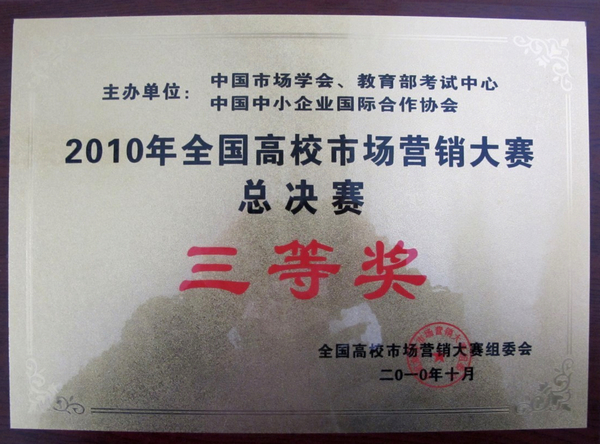 10月23日至24日,由中国市场学会、教育部考试中心和中国中小企业国际合作协会共同主办,浙江商业职业技术学院承办的“2010全国高校市场营销大赛总决赛”在杭州举行。我院代表队获得总决赛三等奖。