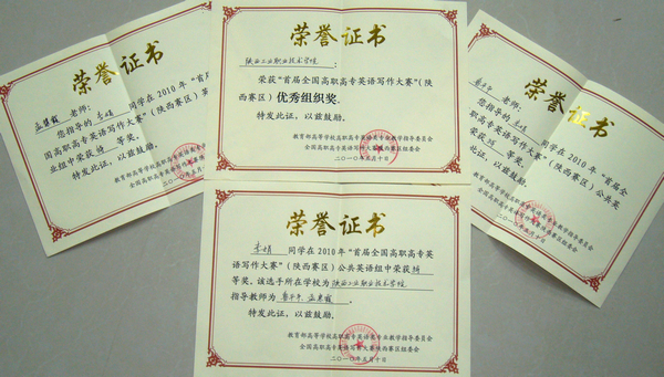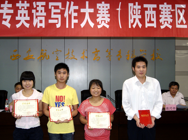 教育部高等学校高职高专英语类专业教学指导委员会主办,西安航空技术高等专科学校承办的首届“全国高职高专英语写作大赛”(陕西赛区)成绩揭晓,由基础部鲁平平、孟慧霞老师指导的材料0805班李娟同学经过学院推荐、全省评选一举夺得省赛公共英语组特等奖,学院获得“优秀组织奖”。