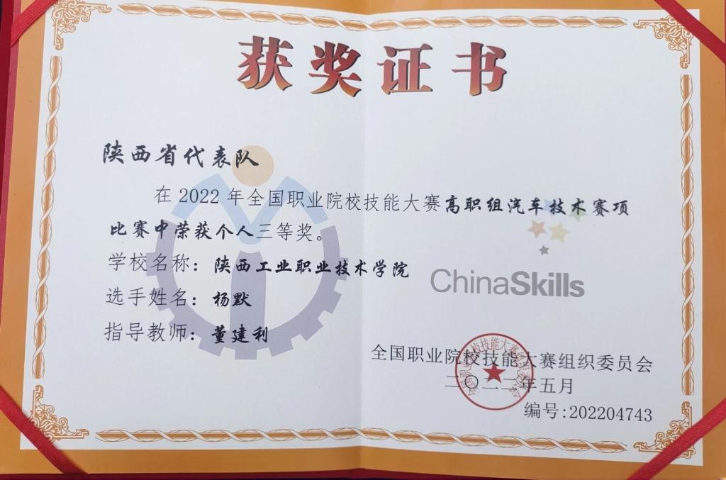 8月8日-10日,2022年全国职业院校技能大赛高职组“汽车技术”赛项在河北邢台成功举办,全国61支代表队同场竞技。在为期三天的竞赛中,参赛选手围绕传统汽车(发动机管理+车身电气)、纯电动汽车、智能网联汽车等三大技术方向四大技能模块展开激烈角逐。我校汽车工程学院杨默(新能源2001班)同学勇夺三等奖。