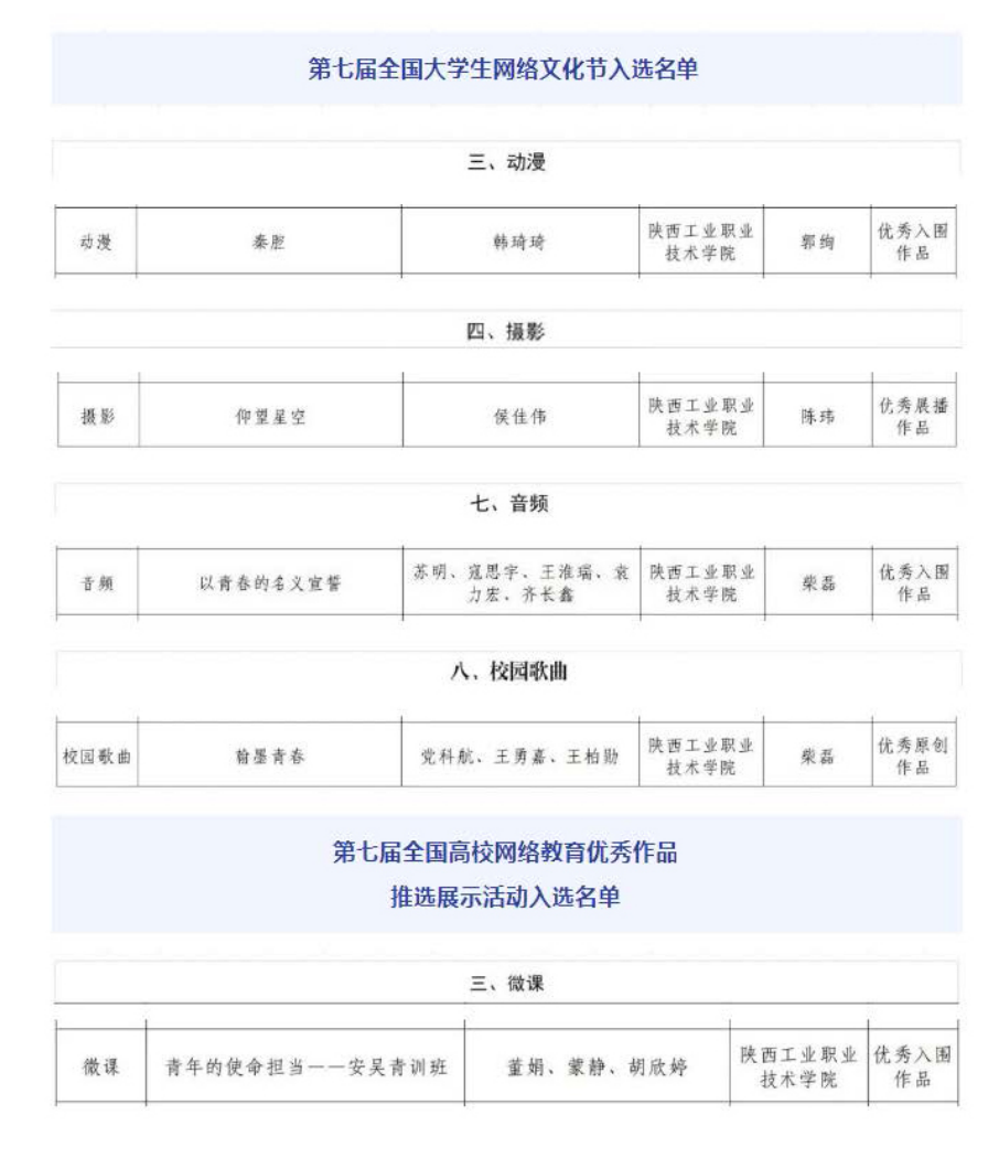 近日,教育部思想政治工作司、中央网信办网络社会工作局公布了第七届全国大学生网络文化节和全国高校网络教育优秀作品推选展示活动入选名单。我校与全国高校同台竞技,在动漫、摄影、音频、校园歌曲、微课等五个赛项中获得奖项,获奖作品种类和数量位居陕西高职院校首位。我校动漫作品《秦腔》获优秀入围作品,摄影作品《仰望星空》获优秀展播作品,音频《以青春的名义宣誓》获优秀入围作品,原创歌曲《翰墨青春》获优秀原创作品,微课《青年的使命担当——安吴青训班》获优秀入围作品,是陕西省获奖数量最多的高职院校。
