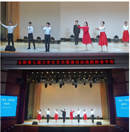6月13日晚,我校原创朗诵作品《延安,永远的精神航标》在朗诵专场中精彩亮相,与来自全国各地的30所高校同台竞演,荣获艺术表演类一等奖,优秀创作奖。《延安,永远的精神航标》由我校客座教授杨焕亭老师精心创作,以讴歌延安精神为主题,用情真意切的语言描绘出延安的峥嵘岁月图景,引导广大青年坚定理想、胸怀家国、奋力筑梦;展演现场,同学们以饱满的热情和精彩的演技,展现了我校学子的文化素养和青春风采。演出前,学校党委副书记贺天柱到现场看望了参演师生,对老师和同学们的辛苦付出给与了肯定与鼓励。